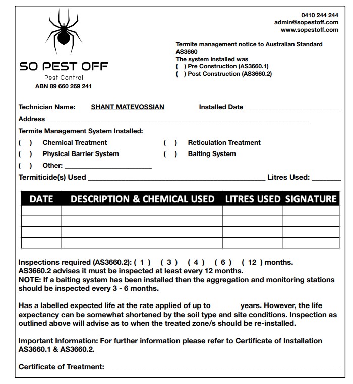 You should possess a termite management certificate, a durable notice (typically found inside the meter box), and documentation from the builder or pest control company. These documents will outline the type of system installed, the installation date, and the maintenance schedule.